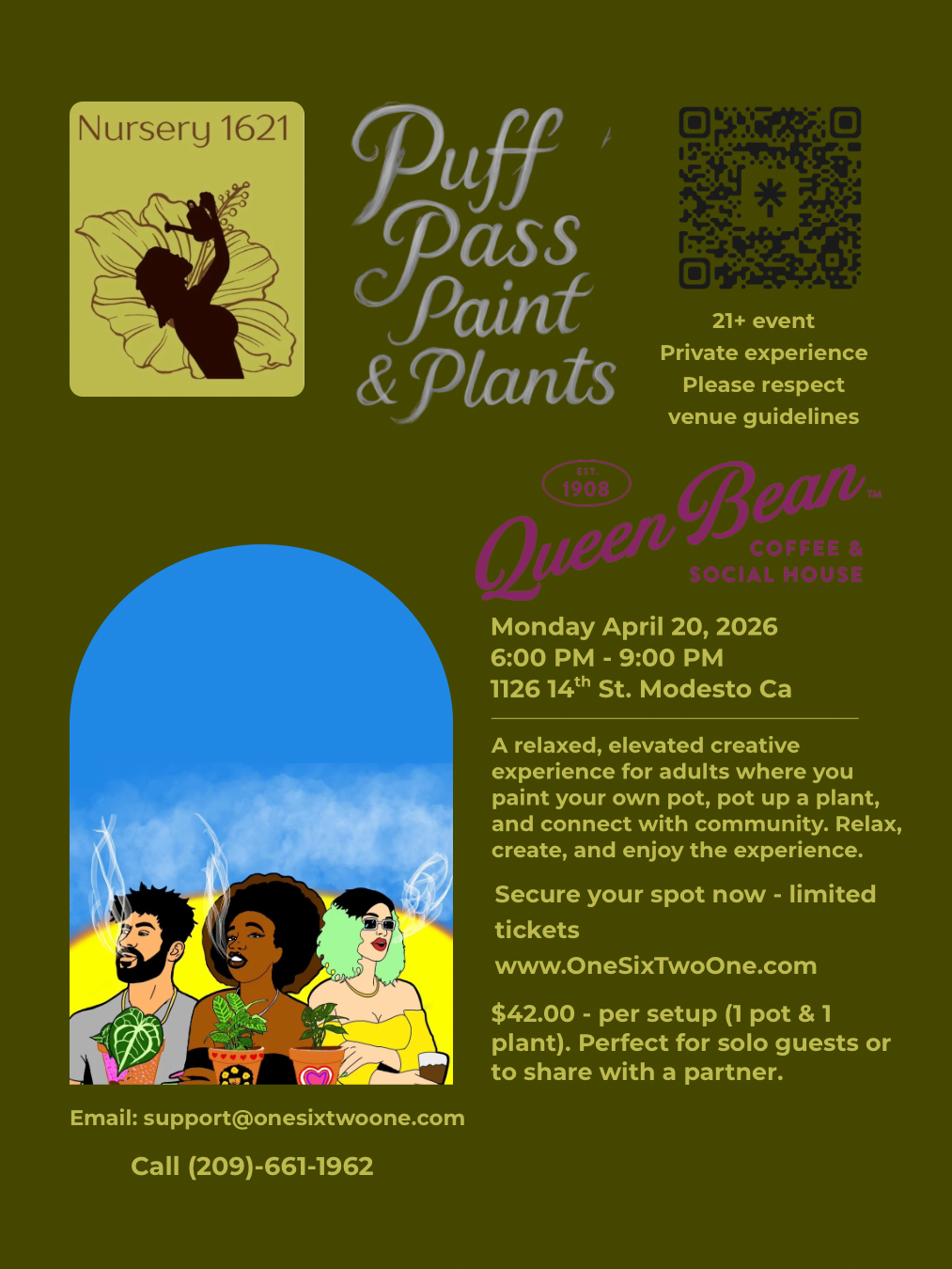 Kick back this 420 and get creative at our Puff Pass Paint & Plants! $42 is perfect for a solo guest or to share with a partner — each ticket includes 1 plant, 1 pot, perfect for solo guest or to share with a partner. All art supplies tools and plants.